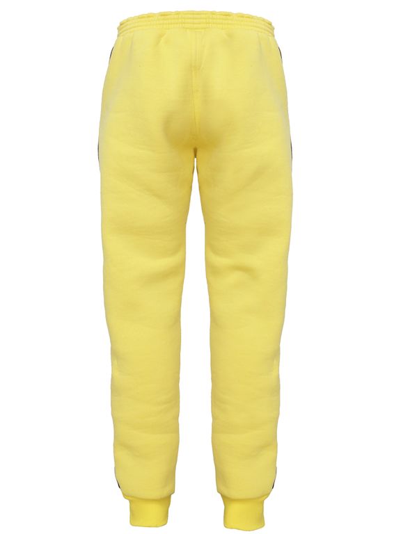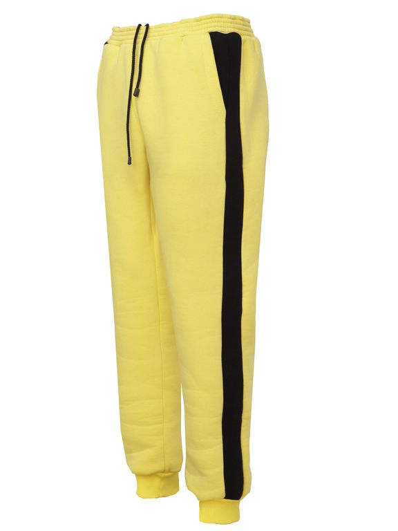 Теплые спортивные брюки, желтого цвета с вертикальной черной вставкой, к низу заужены, из эластичного трикотажа с начесом (в процессе ношения данная ткань может оставлять следы ворса). Боковые карманы открытые, без молнии. Модель с высокой посадкой, широкий пояс-резинка с внутренним шнурком, низ брючин на манжете. Комфортные брюки прекрасно подойдут для зимних прогулок, отдыха и занятия спортом на свежем воздухе.