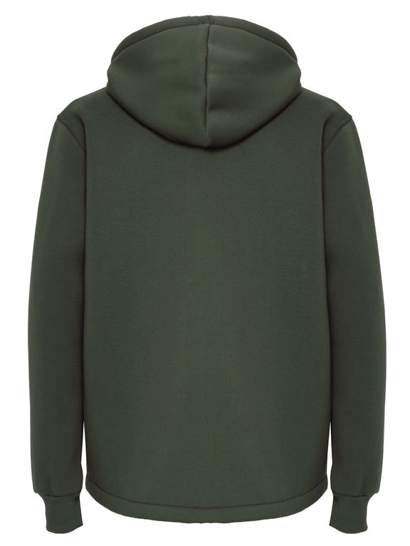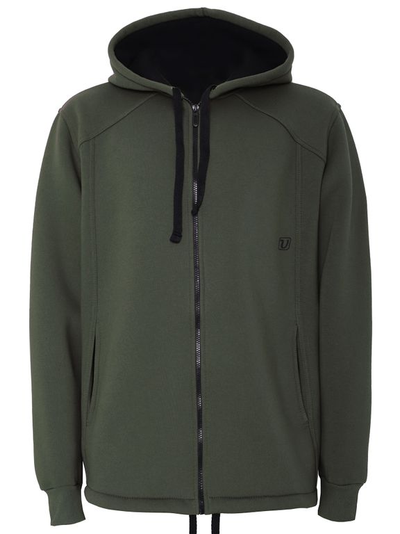 Утепленная толстовка свободного кроя, выполнена из плотного эластичного хлопкового трикотажа с начесом (в процессе ношения данная ткань может оставлять следы ворса). Модель застегивается на молнию и имеет не отстегивающийся капюшон. Низ изделия прямой с утягивающим шнуром, манжеты рукавов на эластичной резинке, что обеспечивает комфортную посадку. Дополняют образ два вместительных боковых кармана без молнии. В зависимости от размера, длина изделия по спинке равна (от 80 до 90 см.).